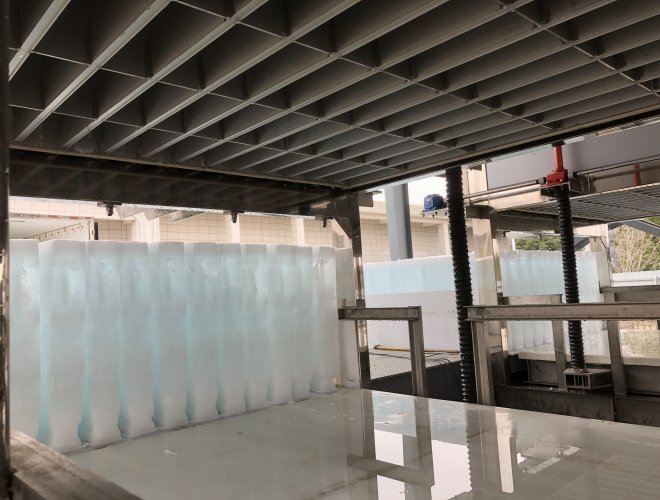 ●自動(dòng)化程度高,自動(dòng)上水、自動(dòng)制冰、自動(dòng)脫冰。脫冰后可直接推送裝車,也可將冰塊推送到輸送帶上,自動(dòng)輸送到冰庫,自動(dòng)碼垛。